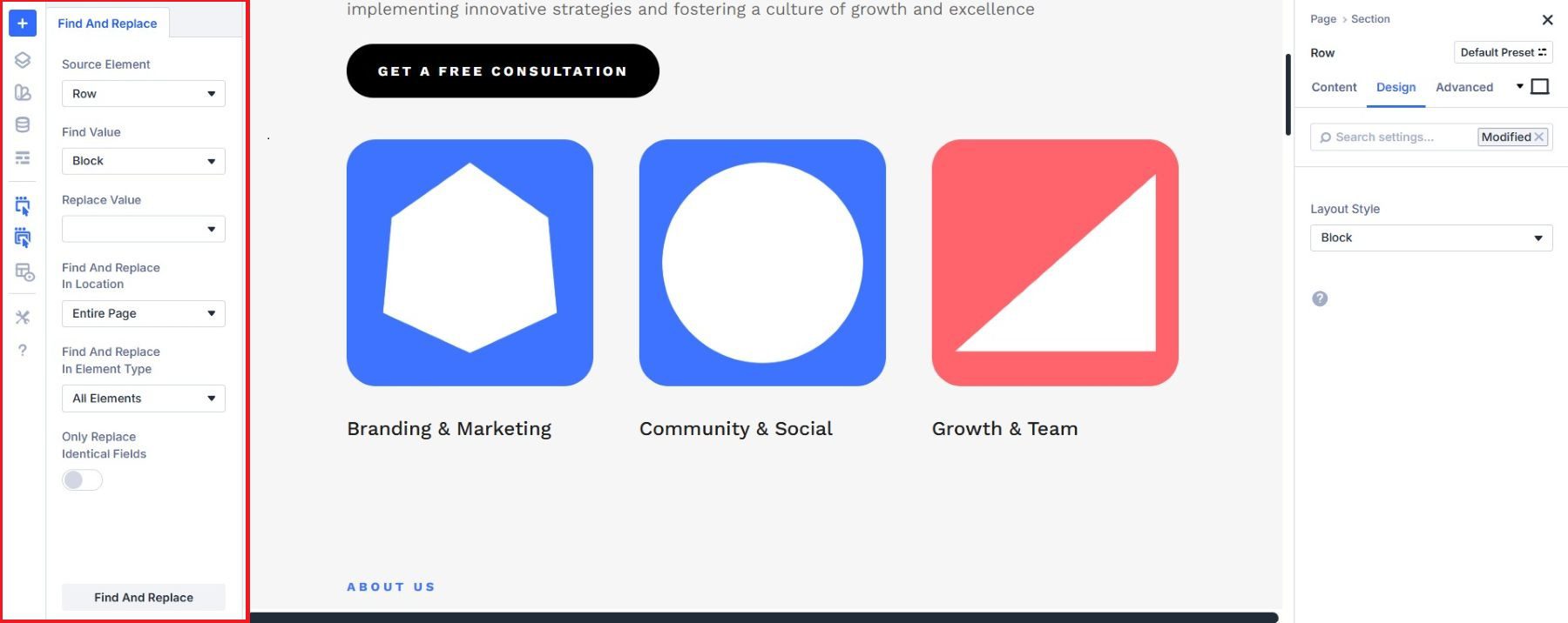 For more focused value-level updates, Find & Replace lets you swap a specific setting across your layout in one step, keeping color variable or font-size changes contained and controlled.