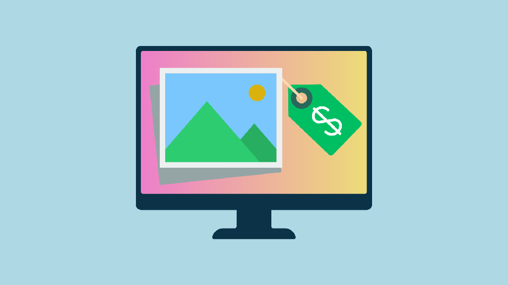 'How to sell photos online' –an image of a computer monitor, displaying graphics of a photograph with a price tag attached to it.