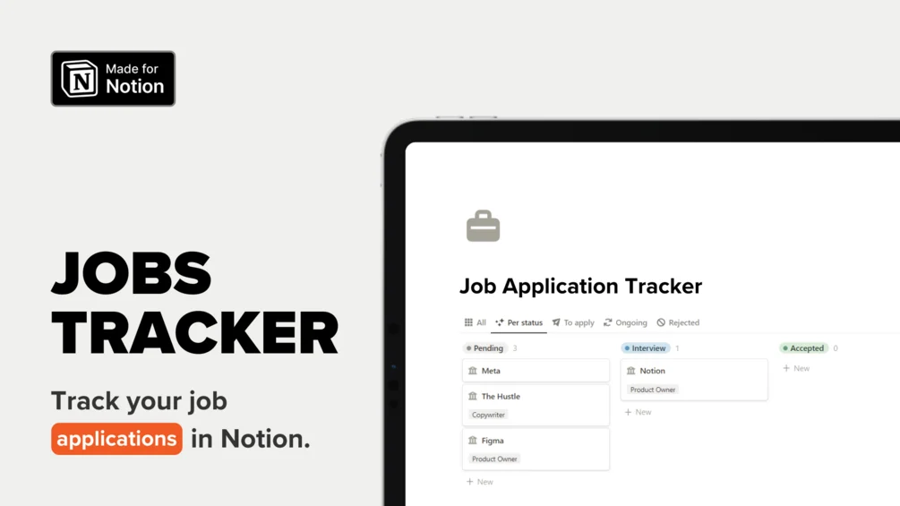 Notion templates Notion Job Application Tracker March 15, 2026 Monkey 0 Views 0 Comments Get ready to land your dream jobThe Jobs Dashboard is a simple Notion template that allows you to keep track of all your job applications to help you better process them, and measure progress. Appl… Source link