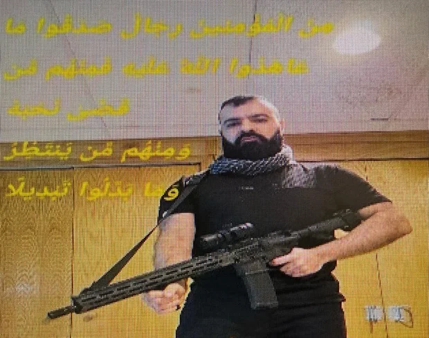 In the photo, the Temple Israel synagogue attacker, Ayman Mohamad Ghazali, is wearing all black with a black and white scarf and is holding what appears to be a semiautomatic rifle with a scope attached. The photo is edited with verses from the Quran in yellow Arabic text.